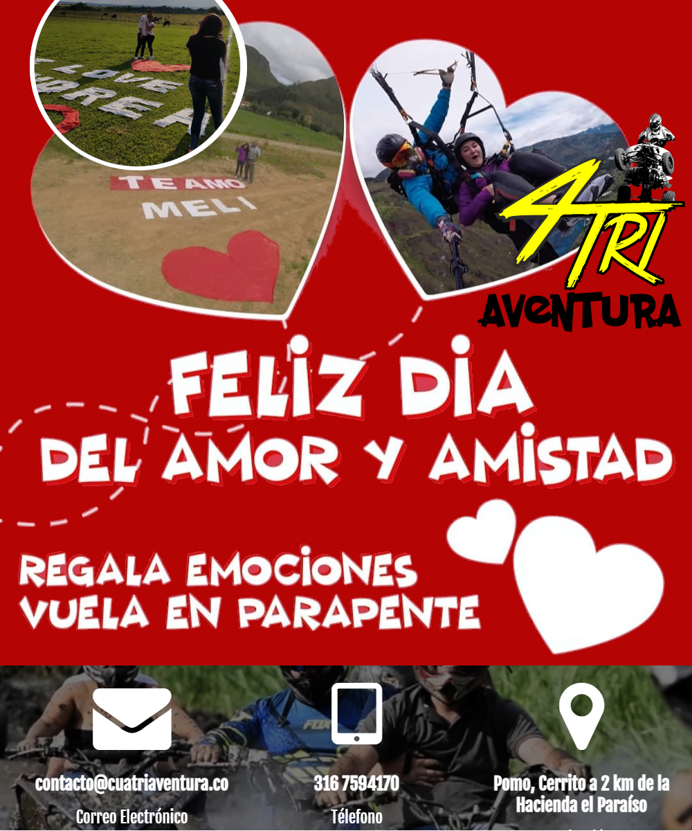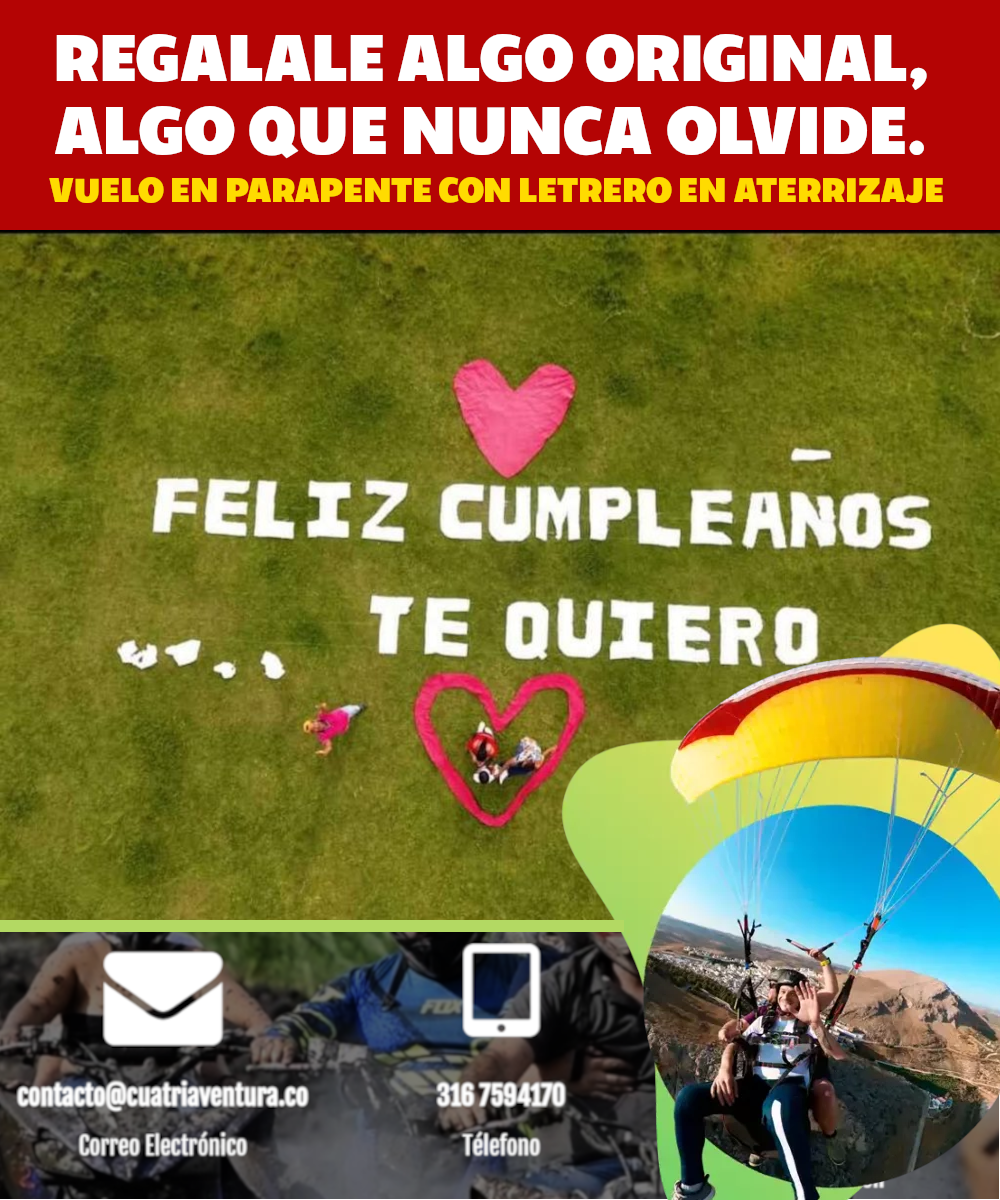 LETRERO EN EL ATERRIZAJE Sorprende a esa persona especial de una manera única y genuina con un letrero gigante en el aterrizaje con letras blancas en tela y corazones rojos donde podrás colocar el mensaje que desees dedicar. El mensaje contiene 20 letras Valor x letra adicinal: 2.000 VALOR: 70.000 COP El parapente es un […]