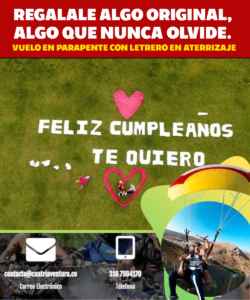 El parapente es un planeador que no necesita de un motor para ser impulsado, solo se requiere de situarnos en las pendientes de nuestras montañas para realizar esta práctica, dando así el paso decisivo entre el cielo y la tierra, donde podemos acceder a un mundo distinto en que el parapente vuela con las aves, y este a su vez se sustenta aprovechando la condiciones climáticas, para así poder disfrutar del vuelo libre sobre los hermosos paisajes del Valle del Cauca.